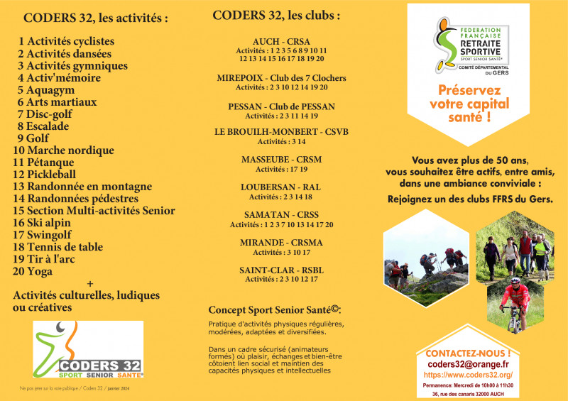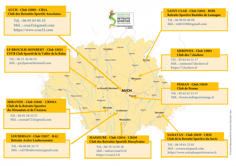 CRSS – CLUB DE LA RETRAITE SPORTIVE DU SAVES Adresse administrative MAIRIE Place de la fontaine 32130 SAMATAN Tel : 06-19-61-23-81 Mail : crssaves@gmail.com Site : https://www.retraitesportivesaves.fr/